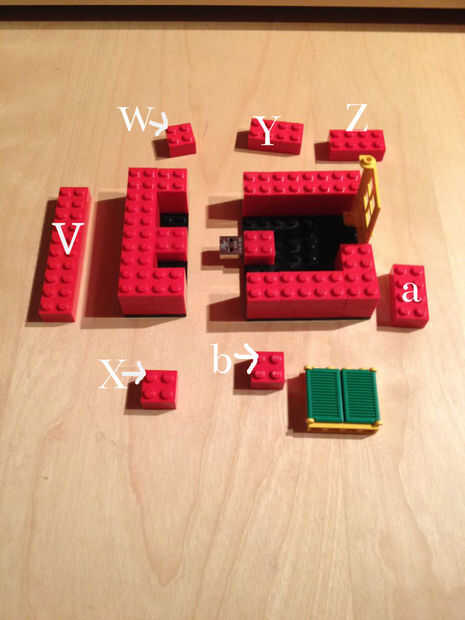 1. en el lado pequeño, una vez más colocar un 2x10(V) en el borde largo y un 2 x 2(W and X) a cada lado para completar el nivel.