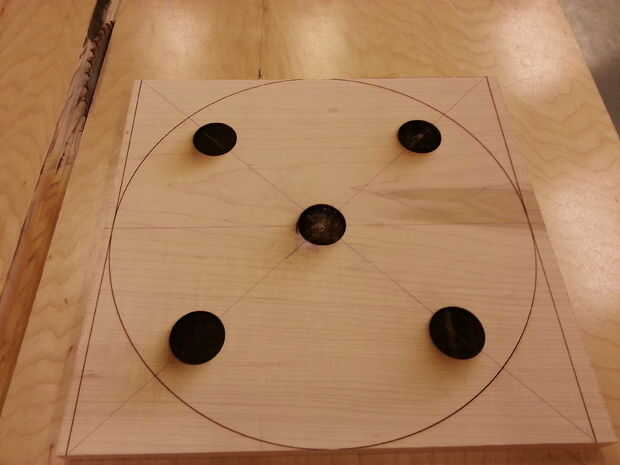 En este paso tienes que marcar el centro del tablero y perfore un agujero muy pequeño (digamos 1/8" de profundidad) lo suficiente para un pequeño clavo o una clavija para moverse dentro y fuera de él. No perfore a través de todo el camino o usted arruinará su superficie plana frontal.