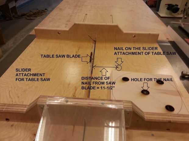 Luego coloque el accesorio deslizante sobre una mesa de sierra como se muestra en la imagen y el martillo en el clavo exactamente 11-1/2", de la hoja de sierra, que es el diámetro de la Junta de pastelería redondo que desea cortar. Ahora coloque el tablero de pastelería que es rectangular en forma de modo que las uñas en el accesorio corredera encaja en el orificio perforado en la placa de pastelería.