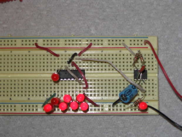 Una vez que el 555 está trabajando para su satisfacción, añadir la etapa contador binario. El pulso de salida del pin 3 del chip 555 se conectará al pin 11 de este chip para incrementar el contador. Tienes que consultar la hoja de datos para su ficha particular, pero para éste, el SN74HC590AN, tuve que conectan el contador y el reloj el registro. Hay formas de utilizar este chip que implican cambiar la cuenta del interna pero no el recuento mostrado, que es interesante desde la perspectiva informática, pero no muy relevante para este proyecto. Pin 12 (habilitar cuenta invertida) y el pin 14 (habilitar salida invertida) ambos se ataron al suelo, mientras estaba conectado pin 10 (inverted master reset / reloj claro) para suministrar.