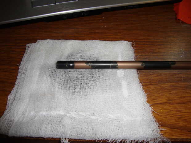 Desea poner la flecha en medio de su pila de Bengala. Presione sobre la flecha a la cuña en el material espumoso. Usted quiere tener suficiente cantidad de material espumoso para envolver alrededor de la flecha. Si eres un poco apagado está bien, pero haz tu mejor esfuerzo para igualar hacia fuera.