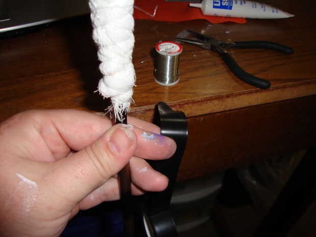 Usted puede ver un montón de paño de queso muestra. Até el cable fuera envolviendo varias veces alrededor del extremo del paño de queso y la flecha. Corte el extremo del cable con alrededor de dos pulgadas queda colgada. Usé para tejer en otras partes del alambre para ayudar a impedir que desentrañar.