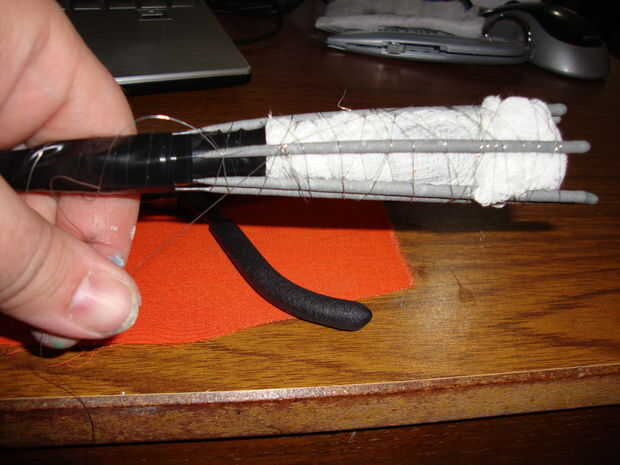Es hora de sacar el carrete de alambre otra vez. Envuelva el hilo varias veces alrededor de las seis luces de Bengala y el extremo de la flecha. Como en el paso anterior deja algunos hilos para tejer en el alambre en su lugar. Una vez tienes el cable seguro, reanudar su cinta y la cinta por el extremo del alambre.