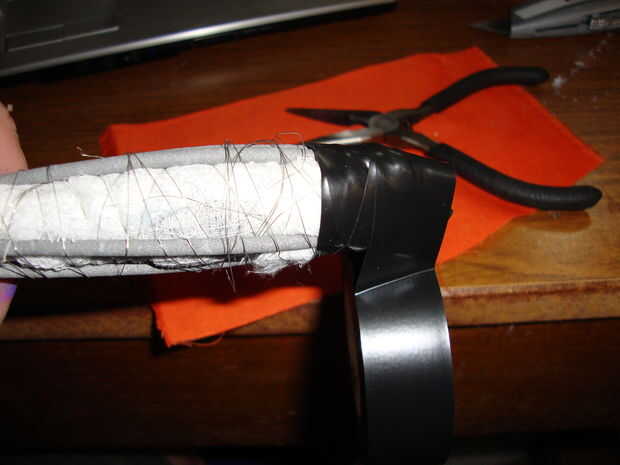 Ahora toma la cinta hasta el final de la flecha. Tu objetivo es mover los extremos de las bengalas tan juntos como sea posible. No obtener una verdadero punta, pero lo mejor que puede. Esto lo ayudará a volar en el aire un poco mejor.
