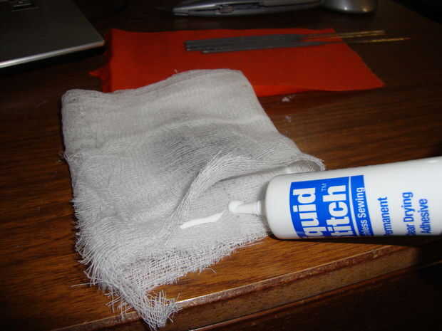 Para asegurarse de no perder ninguno de su material, usted puede pegar los lados juntos. Usé puntada de líquido, que puede encontrarse en áreas de la tela en tiendas. Me siento pegajoso pegamento también funcionaría, tuve líquida puntada en mi cajón así que siguió adelante y ponerlo a utilizar.