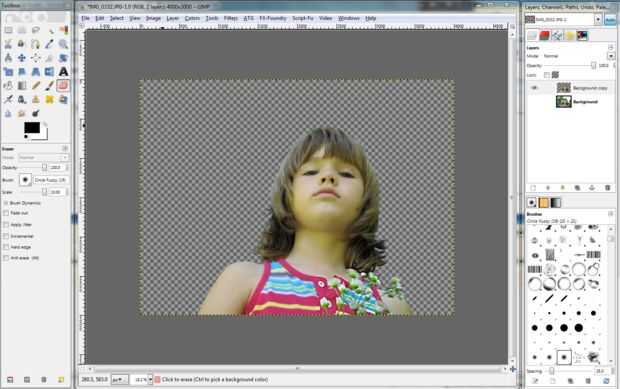 Usando el borrado de la herramienta de borrador del fondo. Comencé con cepillo borroso (19) con la escala establecida en 10. Puede que necesite cambiar el tamaño o escala cuando empiezas a eliminar el fondo cerca de tu sujeto. Este paso toma tiempo.