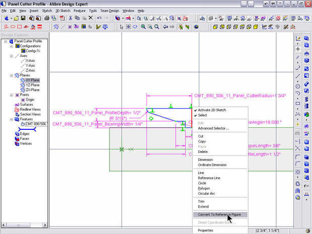 Después de crear el dibujo, haga clic derecho sobre la línea sobre la que se refleja el perfil y seleccione "Convertir a la figura de referencia" para convertir el Regular figura a una figura de referencia. Un esbozo válido tiene que ser una figura cerrada, y refleja una línea Regular dividiendo las dos mitades evitará la creación exitosa de una función.