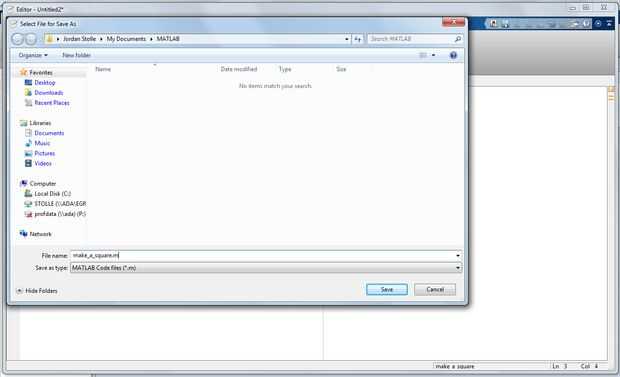Una vez completada su función, excepto la función mediante el guardar botón. El nombre predeterminado de almacenamiento archivo será el mismo que el nombre de la función. Asegurarse de que no cambie esto. Cambiar el nombre del save que no es el mismo como el nombre de la línea 1 puede hacer que la función no funcione correctamente. Tenga en cuenta que, como en el paso 2, versiones anteriores de MATLAB no tiene el botón resaltado, así ahorro debe realizarse también a través del menú archivo.