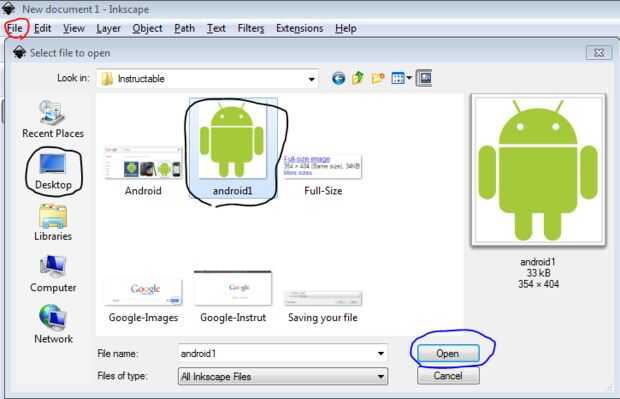 Ahora abre tu imagen edición software como Coral Draw o InkScape, que usando InkScape. Ahora abre tu imagen por ir a 'Archivo' en la esquina superior izquierda del software de edición y luego haciendo clic en abrir. Navegue hasta su escritorio y simplemente por su parte, haga clic en open.