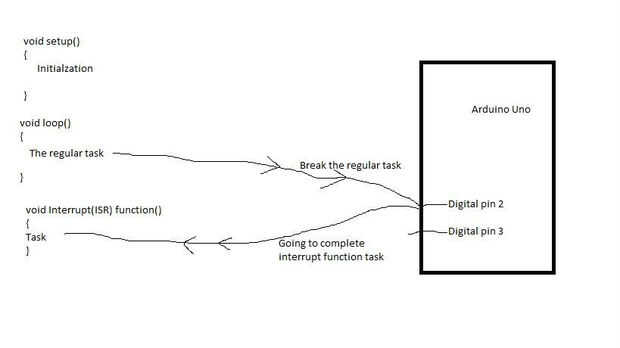 Adruino tiene varios tipos de interrupciones. Interrupción es un proceso por el cual arduino detiene su tarea regular o detener su bucle e ir a interrumpir la función para completar su tarea de función de interrupción dado. Interrupción externa creado externamente. Hay sólo dos pin de interrupción externa en el arduino uno. Son Digital pin 2 y pin Digital 3.