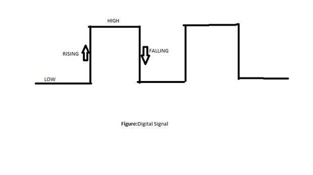 Aquí, el Pin 13 se declara como salida. En attachInterrupt() primer parámetro de la función es "0". Esto es cero ya que vamos a utilizar el pin digital 2 como interrupción externa. Aquí "parpadear" es una función de interrupción. Puede dar cualquier nombre si desea. Hay cuatro estado de modo que son baja, cambio, levantándose, cayendo y una extra para arduino debido alta. Utilizamos el caer. Arduino funciona en señal digital. En la señal digital ha estado cuatro. Se muestran en la figura. Utilizamos cae, significa cuando en el pin 2 sentido una señal caída de borde, se irá a interrumpir la función. Y completar la tarea.