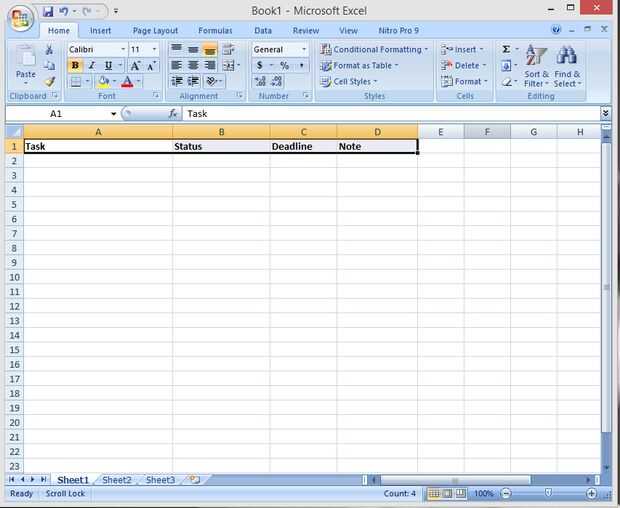 Entrando en algunos encabezados para su columna. Aquí tengo el nombre de tarea, estado, fecha y nota. Según la naturaleza de su trabajo, puede añadir tantas columnas como necesite. Por ejemplo, para sus tareas, puede observar a persona de contacto, herramientas requeridas, o incluso notas de presupuesto y así sucesivamente.