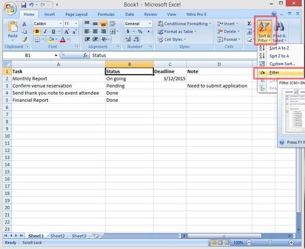 Para ello, haga clic en cualquiera de los encabezados (primera fila). Continuación, seleccione filtro en el menú ordenar y filtrar.