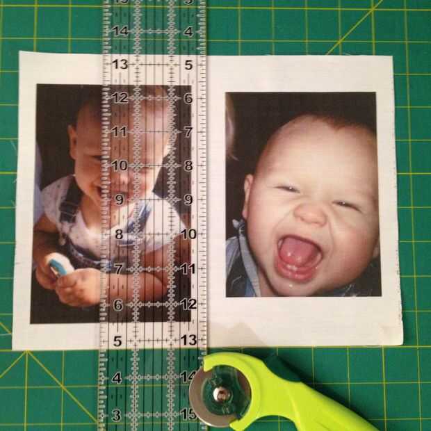 Utilizar una regla, cortador rotatorio y alfombra de auto-sanación para recortar un margen de 1/2" alrededor de cada imagen. Estas son sus bloques de foto. Si nunca has usado un cortador rotatorio y alfombra de auto-sanación, ahora es el momento de empezar. Realmente hace el proceso mucho más fácil!