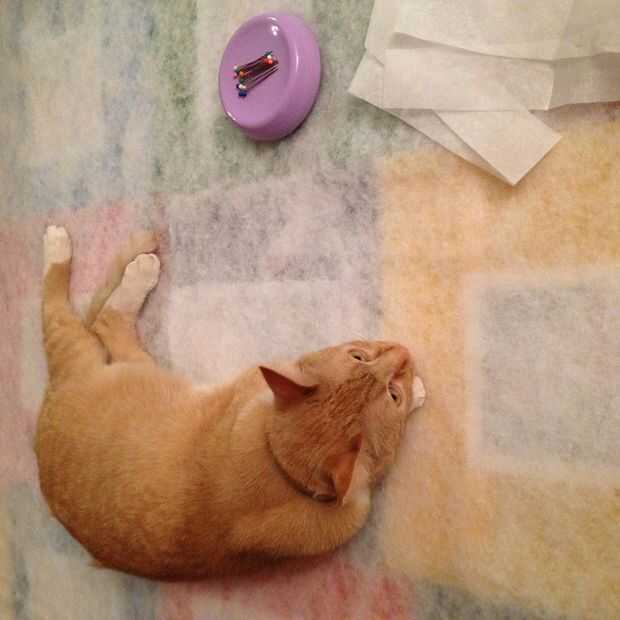 Extiende la tela del paño grueso y suave en el piso, lado derecho arriba. Asegúrese de que esté lisa y libre de arrugas. Establecer la derecha superior, dejar de fumar en el paño grueso y suave, asegurándose de que hay una orla de paño grueso y suave en la parte superior del edredón y que ambas piezas son lisas. Extender una capa de guata en la parte superior del paño grueso y suave del tejido y tejido parte superior, haciendo un emparedado de los tres. En este punto, puede que necesite la ayuda de un gato para mantener abajo el bateo. (Es broma). Recortar el bateo a un poco más grande que la parte superior de la colcha.