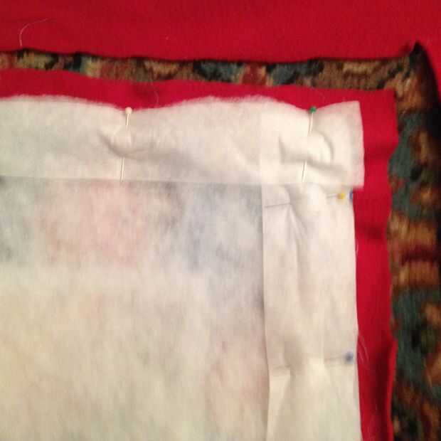 Las tres capas alrededor de los cuatro lados del perno. Utilizar un montón de clavijas! He insertado una tira de papel de seda encima de la colcha insertar pernos. El tejido hace más fácil coser porque el pie no se atascan en el bateo. Cortar el lana alrededor de una pulgada más ancha que la parte superior de la colcha.