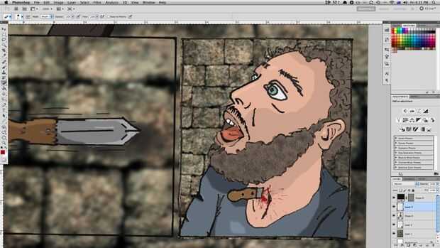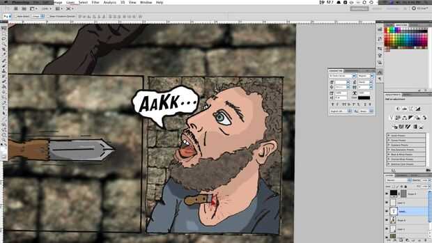 Luego he añadido algunos efectos - para mostrar el movimiento de la cuchilla, que usé la herramienta dedo para 'difuminar' el cuchillo por lo que tiene la apariencia de movimiento. Utilicé un pincel de salpicaduras que descargaron por la sangre y había creado un bocadillo de diálogo de efectos de sonido de la víctima.
