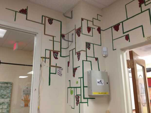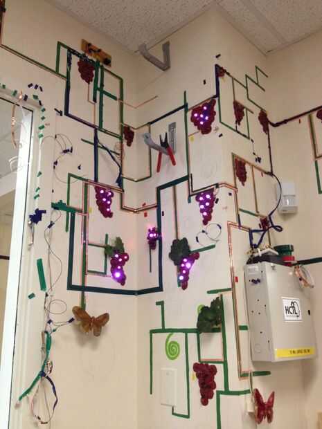 Inspirado por el MIT Media Lab "Living Wall", hemos creado esta pared interactiva para imitar a un circuito de vida en el Hackerspace de Laboratorio de interacción humano-computadora de la Universidad de Maryland. Funciones incluyen uvas iluminados, capacitivo touch sensores para encender luces en uvas seleccionadas y altavoces caseros mariposa mariposas de LED extraíbles que nos gusta llamar butterflights!