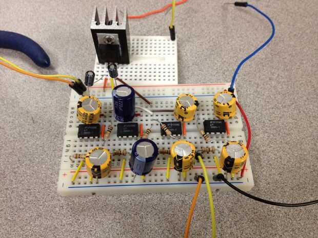 Instructivo de paso 10 como guía, encontrar donde cada pin de salida de audio (cable azul) es en el protoboard para cada amplificador que ha creado. Conecte un cable a los pines. Conecte cada uno de estos pines a un altavoz de mariposas diferentes.