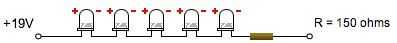 Utilizando el diagrama del circuito en las imágenes de arriba, coloque los LEDs en el perfboard dondequiera que usted tiene gusto. Conecte el pin positivo en el primer LED a un extremo de la resistencia girándolas juntas. Luego, conecte el pin negativo del LED a la patilla positiva en el LED siguiente girándolas juntas. Continúe esto hasta que todos los LEDs están conectados entre sí en serie.