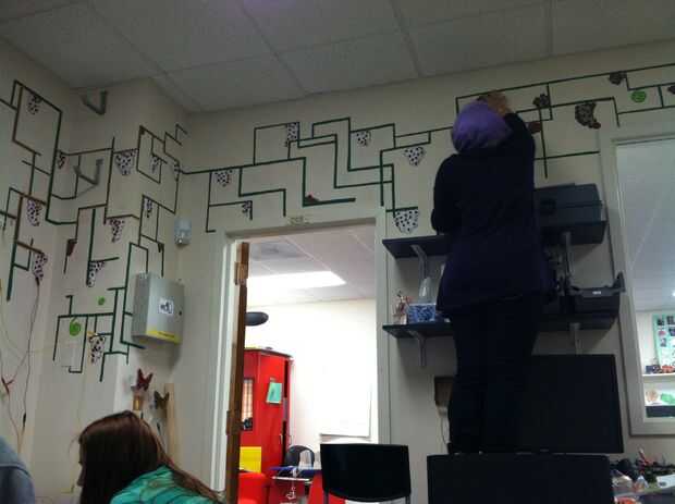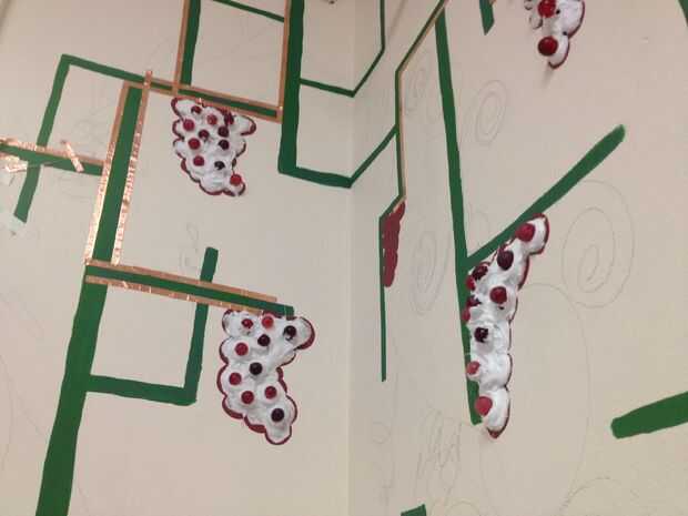 Mueven su cepillo en la pasta en un movimiento circular para mover la goma. Tratar de imitar la pintura circular que había en la pared. Crear un montículo pequeño, esférico en el interior de cada círculo uva y cada uva. Utilizando los círculos uva pintados en la pared como una plantilla, crear un montículo circular lo suficientemente grande para una uva sin un LED.