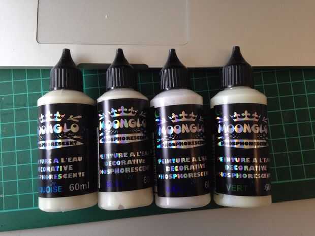 He probado la marca que se muestra en la fotografía (moonglow) y el verde era el color más eficiente. Finalmente utilicé fue A-75 Jal-luz de seguridad, de una marca Suiza: Jallut.