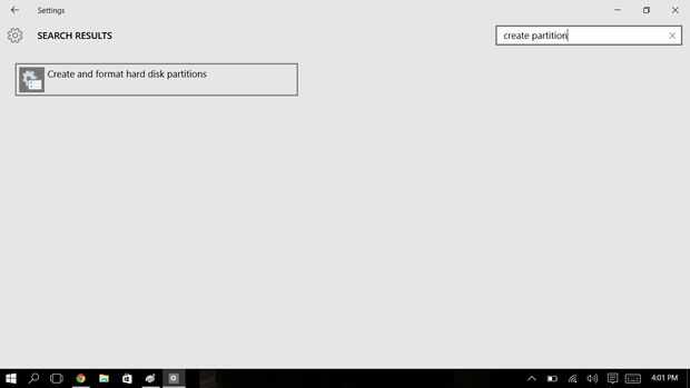 El primer paso para la creación de una partición es abrir toda la configuración en su computadora. En el tipo de la barra de búsqueda en crear partición o administrador de discos. Una de las opciones que aparece debe ser crear una partición de disco. Haga clic en eso y ya está listo para el siguiente paso.