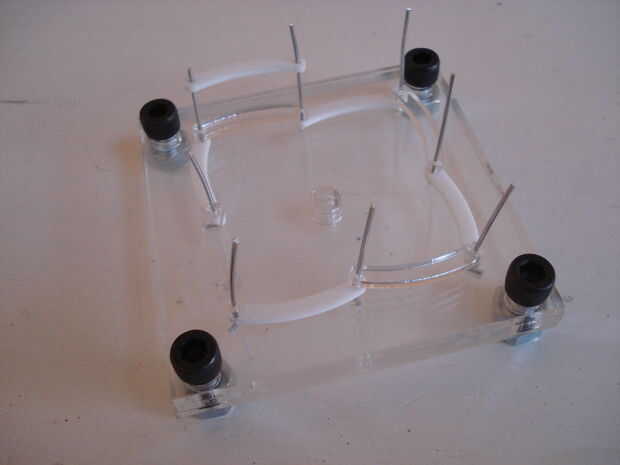 2. cortar las piezas de acrílico en el cortador del laser. La capa inferior tiene sólo cinco hoyos; éstos acomodar los tornillos de fijación de 1/4"-20. La capa media tiene estos cinco agujeros, además de ocho pequeños "canales" para los cables de la pulsera. La capa superior tiene otra vez los cinco agujeros más grandes, además de ocho agujeros más pequeños para los hilos de la pulsera.