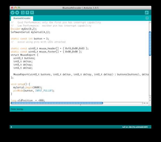 Usted necesitará descargar e instalar la versión especial de Arduino para el Abalorio o realizar los pasos descritos en el tutorial para agregar compatibilidad con Abalorio en instalación existente. También necesitarás las librerías SoftwareSerial y Codificador rotatorio . Estos deben colocarse en el directorio de las bibliotecas apropiadas para tu sistema operativo y la instalación.