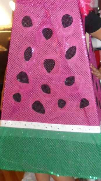 La última capa de tela para aplicar es la parte blanca de la sandía, que se llama la corteza de la sandía. Me pareció mejor utilizar una pistola de pegamento caliente para poner precisamente el blanco de la tela en la parte superior el material verde y rosado. Para agregar brillo, compré pedrería adhesiva para agregar un efecto más de "bling bling".