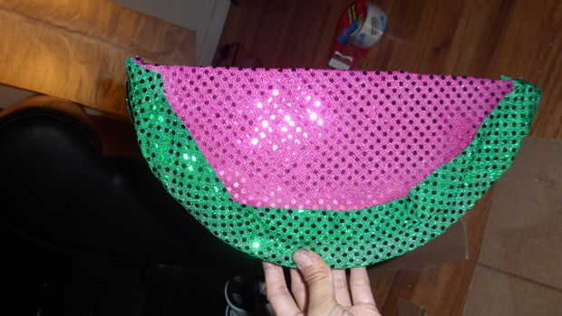 Utilicé una de mis cintas viejas y reunió a la izquierda sobre el material y utilizar una pistola de pegamento caliente para cubrir la diadema con la tela rosa. Agarré un pedazo de espuma circular y cortar en forma de una sandía en rodajas. Luego usé el adhesivo en aerosol para pegar a tela sobre la espuma. Por último, usé la pistola de pegamento caliente para fijar la pieza de espuma de sandía en la cabeza.