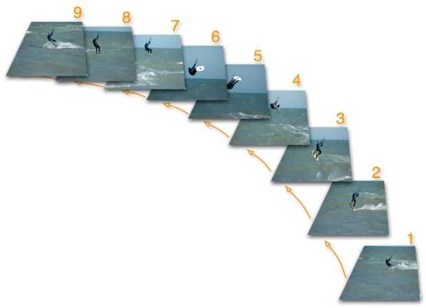 Si el fotógrafo filtró la cámara durante la secuencia necesita a línea de fondo. En el ejemplo aquí utilicé el horizonte para alineación vertical y espaciados el jinete uniformemente para la alineación horizontal, las olas se movían a tuve ningún otro punto común de referencia entre las imágenes. Consejo: empezar por alinear imagen 1 y 2, ajuste todas las imágenes a 'invisible' y ajuste imagen 2 al 50% transparente. Luego mueva la imagen dos hasta que se establezca. Repita con la imagen 3 en el 50% más de 2 y así sucesivamente.