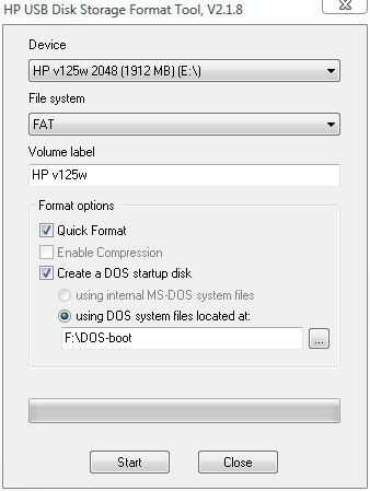 Ejecutar la utilidad de formato de HP UFD (este programa generalmente reside en los programas de la lista bajo el menú de inicio bajo un encabezado que dice "Hewlett-Packard Company.") Seleccione la unidad de la UFD que desea utilizar (ADVERTENCIA! Este proceso destruye todo su contenido, si usted necesita los archivos de este dispositivo, cópielos a un disco duro antes de iniciar este proceso). La casilla de verificación formato rápido y crear una casilla de verificación de disco de arranque de DOS, haga clic en el botón browse a la derecha de la caja de texto para identificar el directorio donde descomprimió los archivos de Windows 98 DOS. Esto produce una pantalla como la mostrada en la primera captura de pantalla.