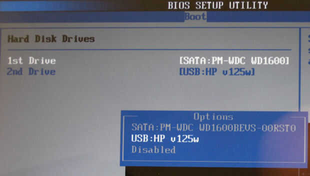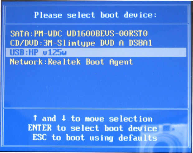 Si pulsar F11 verás una lista de dispositivos que puede arrancar el sistema, con la selección por defecto actual destacó. Utilice las teclas de flecha para mover hacia arriba o hacia abajo, luego pulse Enter para seleccionar el arranque de DOS UFD.