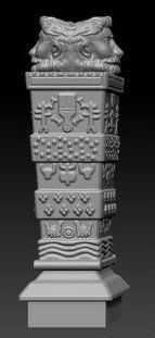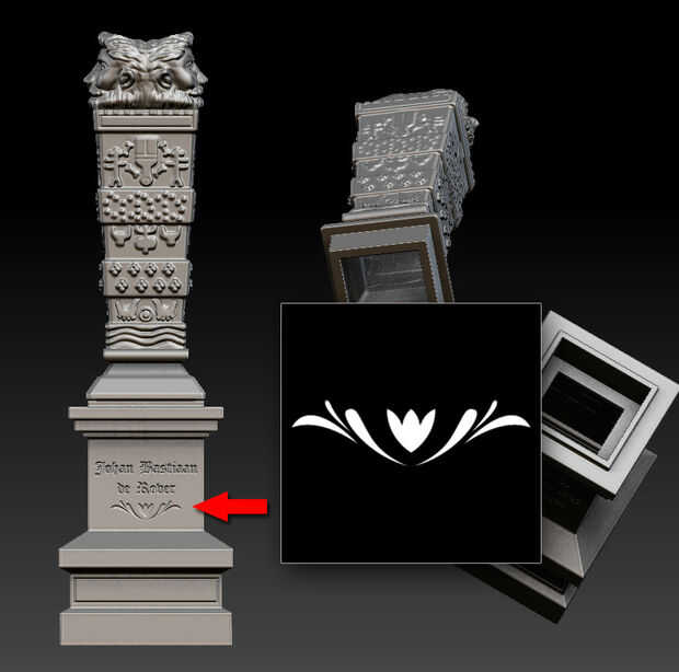 Para obtener los detalles sobre el objeto puede ir múltiples formas; puede ya sea modelo/sculpt les a mano o por ejemplo, los detalles de la máscara, invertirles y saca hacia fuera. Es un proceso fácil y rápido para hacer las cosas rápidamente. Con la mayoría de los iconos en la parte superior de la estatua, me les trazó encima de una foto en un graphicseditor y llenaba los trazos con blanco. Hacer un fondo negro una ahora tengo un supuesto "Alfa" o plantilla que pueda usar en Zbrush. El color blanco es alta y negra es baja. De esta forma puedes dibujar formas precisas y les sacan o hacer otras cosas con él.