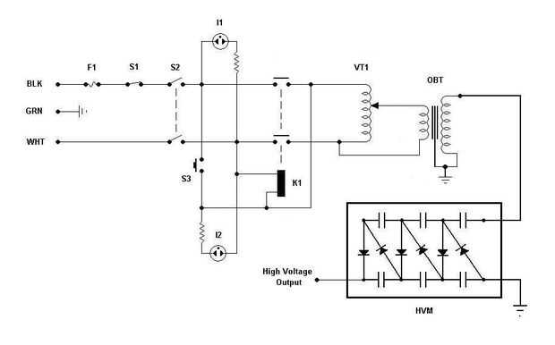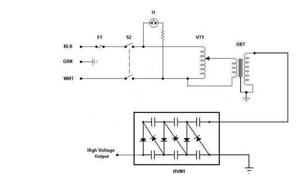 Corriente pasa a través del Variac, VT1 que ajusta el voltaje de entrada para el OBT. El OBT intensifica la tensión de entrada a un máximo de 6.000 VAC. La salida de la OBT se alimenta en el multiplicador de alto voltaje, donde se multiplica a 51.000 VDC salida HVM.