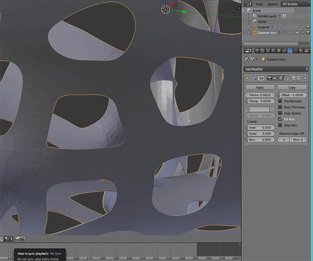 Exportar su malla de Meshlab e importar a Blender. En el panel de propiedades seleccionar modificadores > Añadir modificadores > solidificación. Esta herramienta es bien interactiva en comparación con la herramienta equivalente de Meshlab, incluso si no te dicen cuya tesis se basa en. Los principales parámetros que nos importan son grueso y el desplazamiento. Espesor es auto explicativo. Offset es útil si desea combinar la versión de Voronoi de un objeto con el original. Haciendo la versión de Voronoi compensado levemente de la original le puede aplicar como una textura de la superficie.