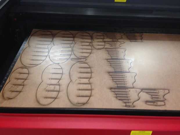 Para este objeto, usé masonite para el diseño. El láser tomó el archivo pdf de Make 123D y utiliza los vectores en ese programa como líneas de corte en el programa principal.