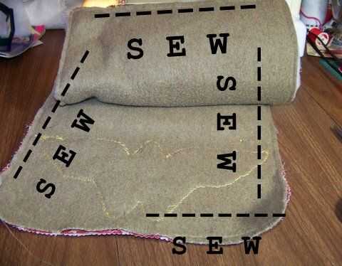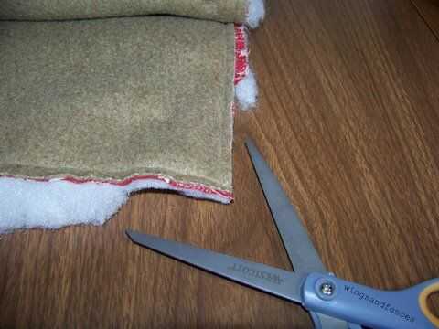 Después de 3 1/2 de los lados han sido cosidos por la máquina, recortar las costuras de la tela sobrante pero tratando de dejar al menos 1/4" de la tela más allá de la costura. Ver foto. También puede recortar una muesca en las esquinas inferiores para que lo menos arrugas cuando la tela es el revés. Cuidado, no corte a través de la costura!