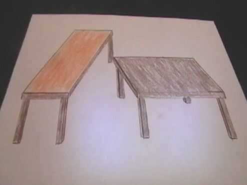 Usando el creyón marrón o lápiz de color, color toda la tabla derecha (patas y todo). Entonces cada parte de la tabla izquierda color marrón excepto el tablero de la mesa.