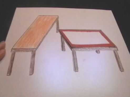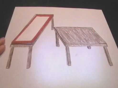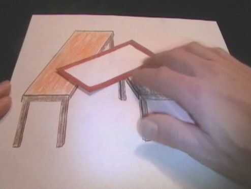 Colocar el recorte sobre la mesa izquierda para demostrar que es el mismo tamaño que el tablero sí mismo. Luego pasar el corte y coloque sobre la mesa de la derecha. Sorprendentemente, ahora está comprobado que ambas mesas son exactamente del mismo tamaño!