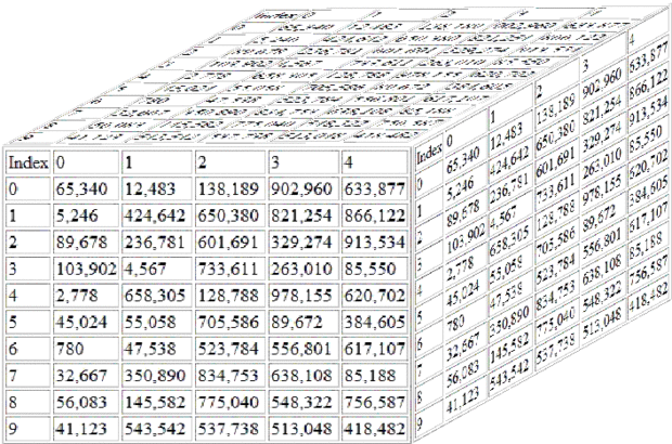 Va mayor que empiezas metiendo interesantes perspectivas. 4 matriz dimensional podría ser considerado como teniendo una línea de los tres cubos dimensionales. Arreglos de discos de seis dimensiones podrían considerarse como un cubo de cubos. Y así sucesivamente.