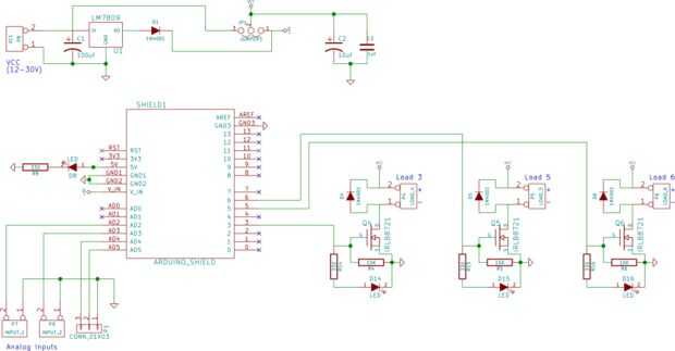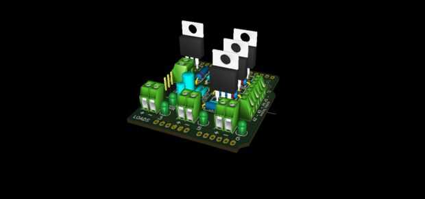 He diseñado un escudo abierto Arduino de fuente a utilizar tres MOSFETs, que se pueden utilizar para controlar motores, solenoides o incluso los tres canales de una cadena de LED RGB!