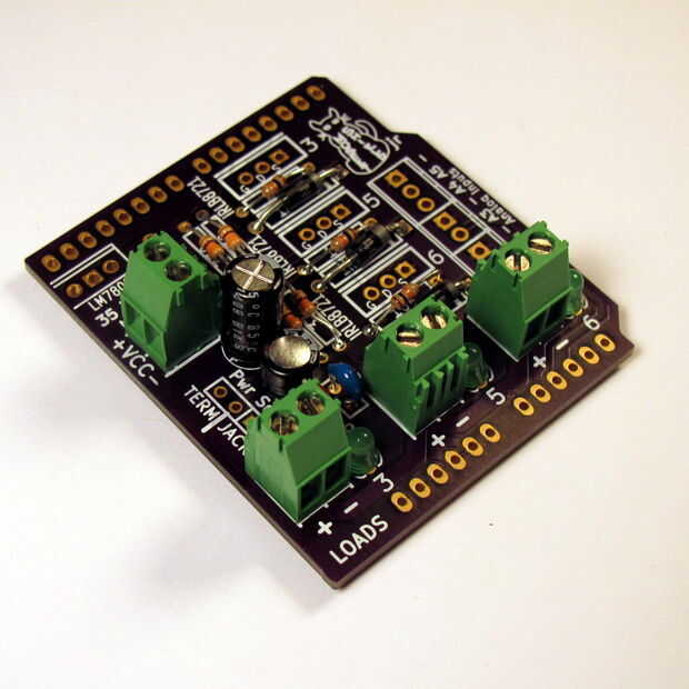 Los terminales de dos posiciones nos permiten una manera fácil de conectar cargas y poder a la Junta. Son opcionales si usted está construyendo una instalación permanente y quiere solo soldar los cables directamente. Esto también se aplica a los terminales de entrada opcionales.