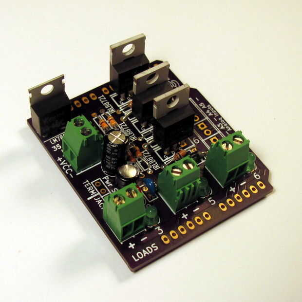 El caballo de trabajo del circuito es el metal – oxide – semiconductor transistores efecto de campo (MOSFET). Actúan como un interruptor para la fuente de alta corriente, usando la señal digital de Arduino como el control. Usted puede aprender más sobre cómo funcionan en el http://en.wikipedia.org/wiki/MOSFET.