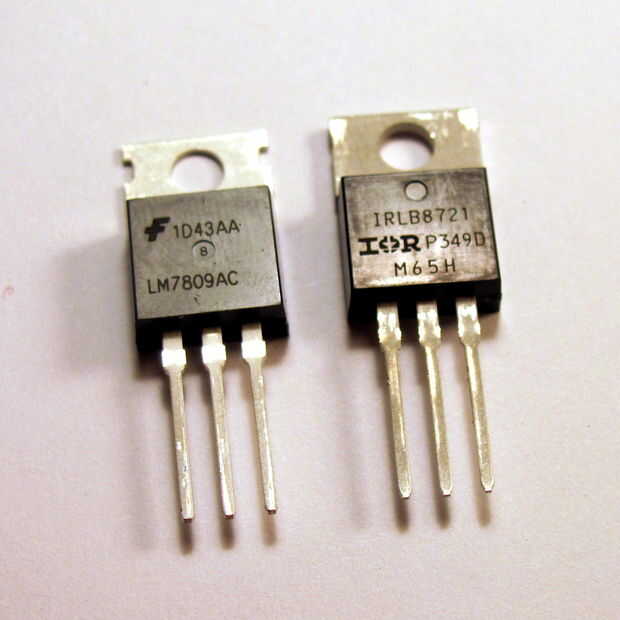 Necesita identificar cuidadosamente la diferencia entre el regulador de tensión LM7809 y los tres MOSFET de IRLB8721 ya que vienen en el mismo paquete TO-220 y parecen bastante similares a excepción de las marcas (ver fotografía).