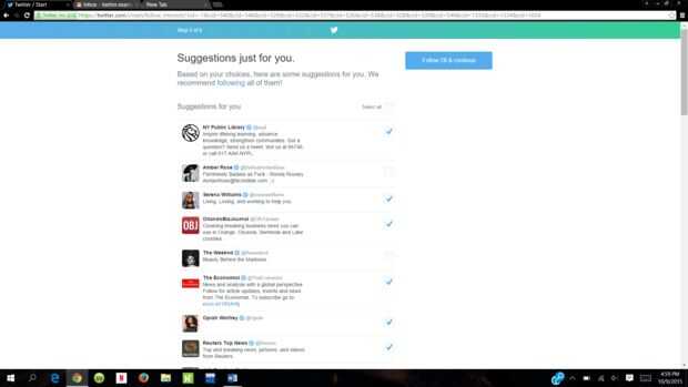 Mostrará sugerencias que desea seguir para mantenerlo actualizado de cualquier noticia/ideas. Hacer clic en o quitan algunas sugerencias antes de hacer clic en "Seguir y continuar" para moverse en la página siguiente.