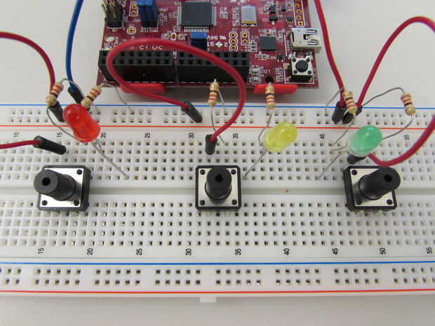 Pero mientras esto se ve bien, nos no hace ningún bien si no podemos dar o recibir cualquier señal de nuestro circuito. Para remediar esto, ejecutar un cable de puente desde el lado del ánodo de cada LED a su propio pin digital en el Uno32 así como un cable de puente desde la tierra de cada botón a su propio pin digital en el Uno32. Usé los pines 5, 7 y 9 para los botones y pins, 31, 33 y 35 para los LEDs.