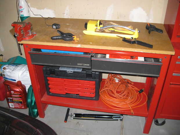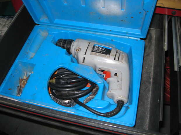 Mi kit de herramientas es la pequeña en el estante inferior de la mesa de trabajo. Tiene todos los fundamentos, destornilladores, llaves, tomas, martillo, alicates, cuchillo de la aguja. Nada demasiado sofisticado. En los cajones de la mesa de trabajo que mantener un sable vio que recientemente fue cavado de almacenamiento cuando mi padre en busca de uno. Decidió comprar una con un poco más de músculo por lo que tengo mantener a este. El taladro es a lo largo de la historia misma, mucho más vieja que yo soy para estar seguro, y cualquier marca JC Penny llevó en ese entonces. Todavía funciona, y prefiero las herramientas con cable a la batería para no tener que esperar a cargar.