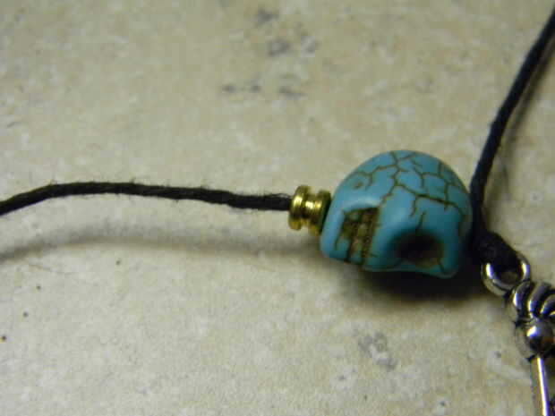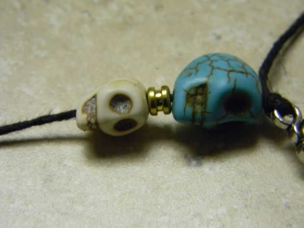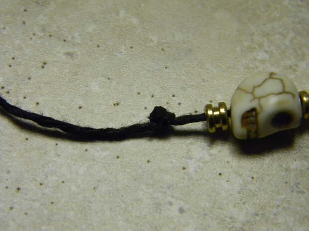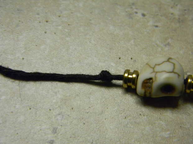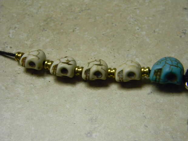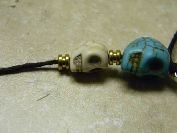 Continuar encadenando pequeños cráneos seguido por extremos de la cuerda de guitarra, hasta que tenga 4 calaveras pequeñas y extremos de cuerdas de guitarra 5. Lo último que